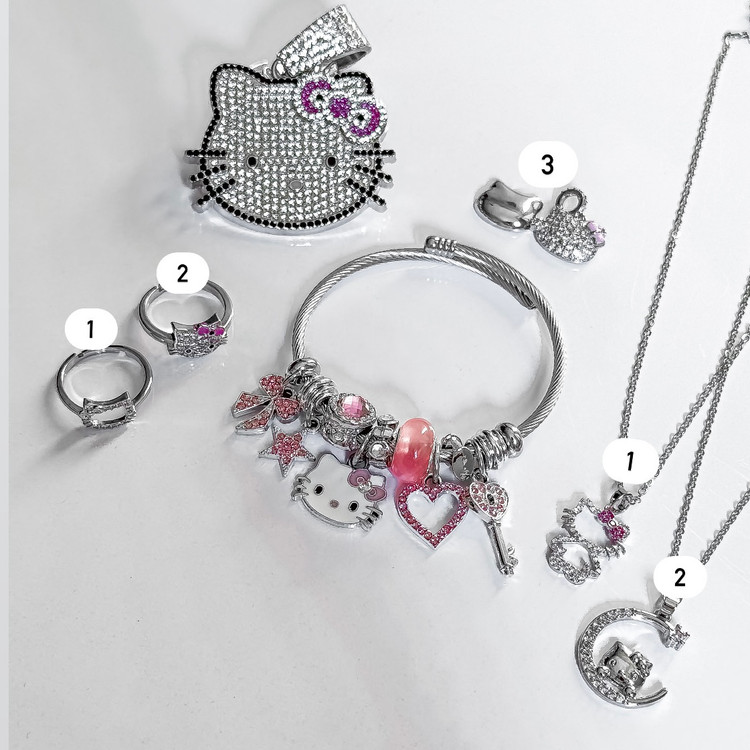 / انگشتر کیتی کد ۱ / انگشتر کیتی کد ۲ / دستبند پاندورا کیتی / گردنبند کیتی کد ۱ / گردنبند کیتی و ماه کد ۲ / لاکت کیتی کد ۳ / پلاک فول نگین کیتی